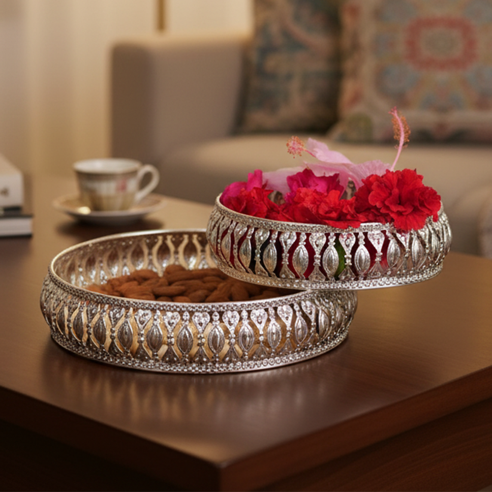 This versatile set functions beautifully as German Silver Serving Trays for presenting appetizers, desserts, or drinks, adding a sophisticated touch to any event. The two graduated sizes allow for a tiered display or use in different areas of your home. Beyond serving, these items are stunning Decorative Filigree Trays perfect for organizing perfumes on a vanity, displaying candles and crystals on a coffee table, or arranging small keepsakes. These Round Metal Platters blend traditional elegance with modern functionality, making them an indispensable addition to any discerning home.