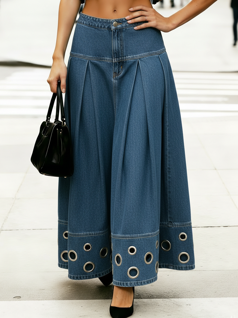Trendy Hollow Metal Eyelet Denim Skirt