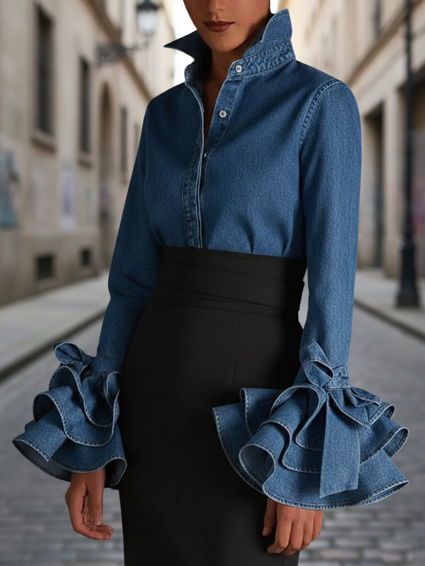 Vintage Elegant Ruffled Sleeves Denim Shirt