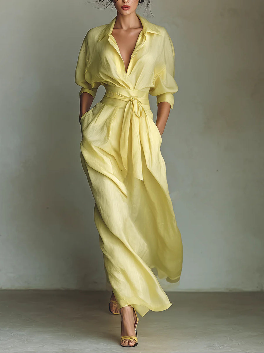Waist-cinching Shirt-style Maxi Linen And Cotton Dress