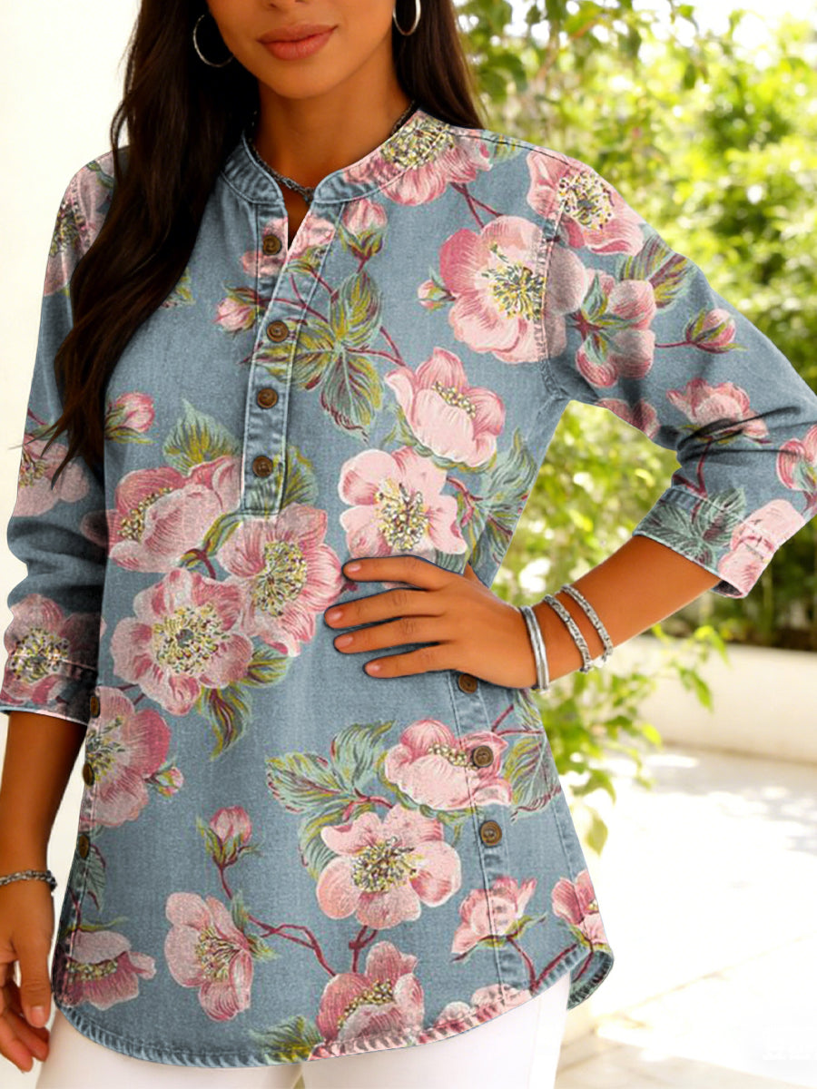 Women's Elegant Floral Decorative Patterns V-neck Long-sleeved Casual Button-up Loose Denim Top