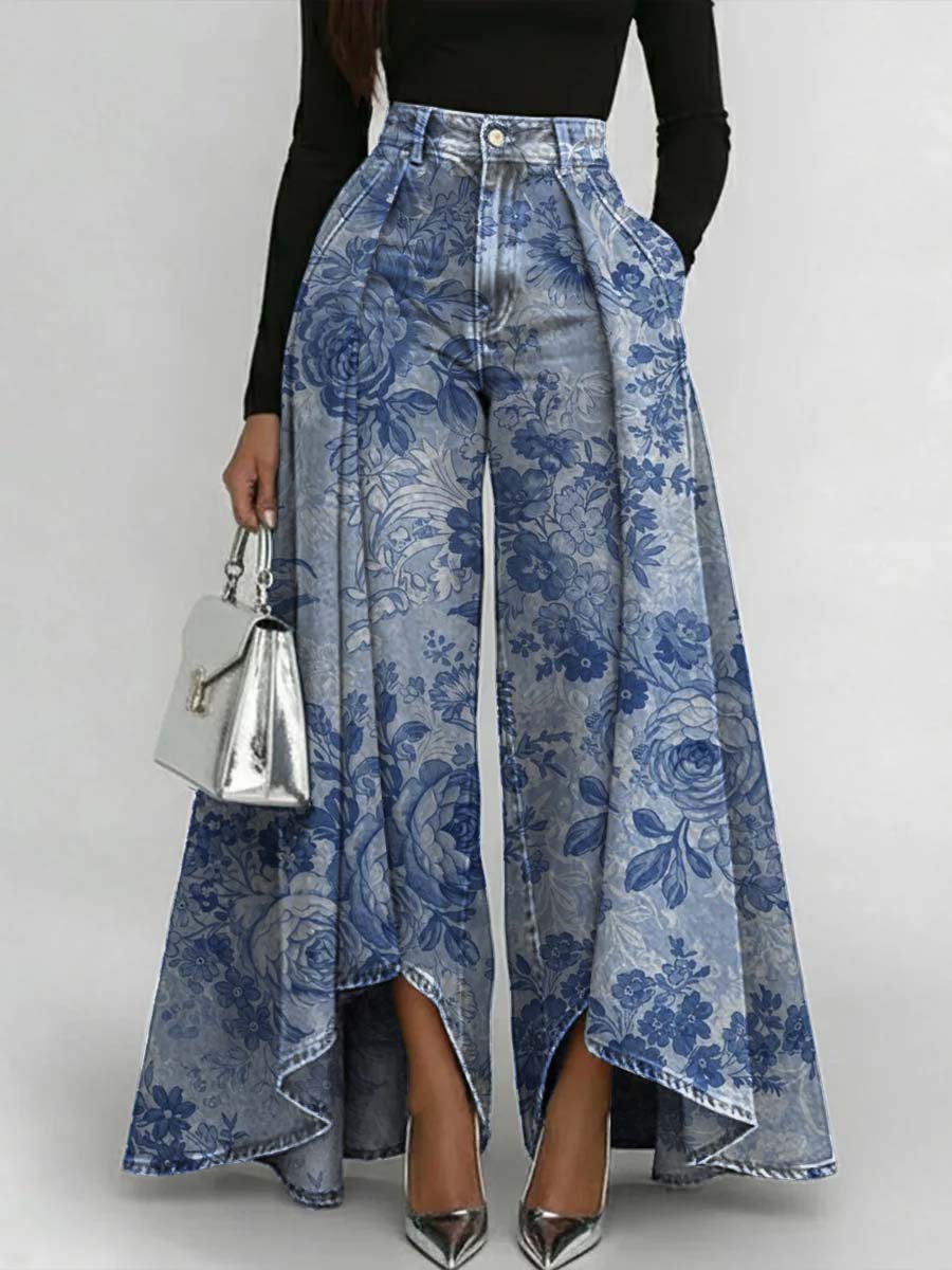 Women's Retro Flower Art Print Casual High-waist Loose Jeans