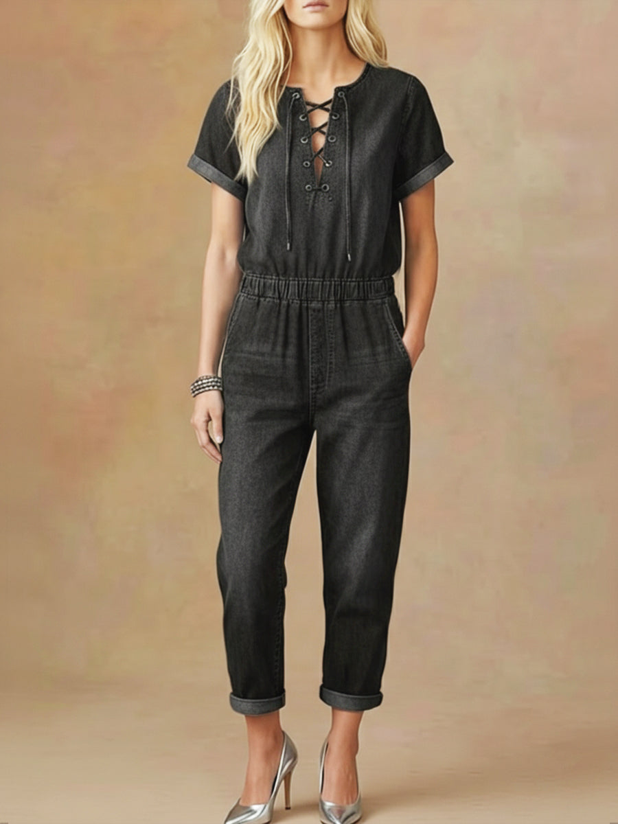 Women's Short-sleeved Denim Jumpsuit With Tie-neck Detail.
