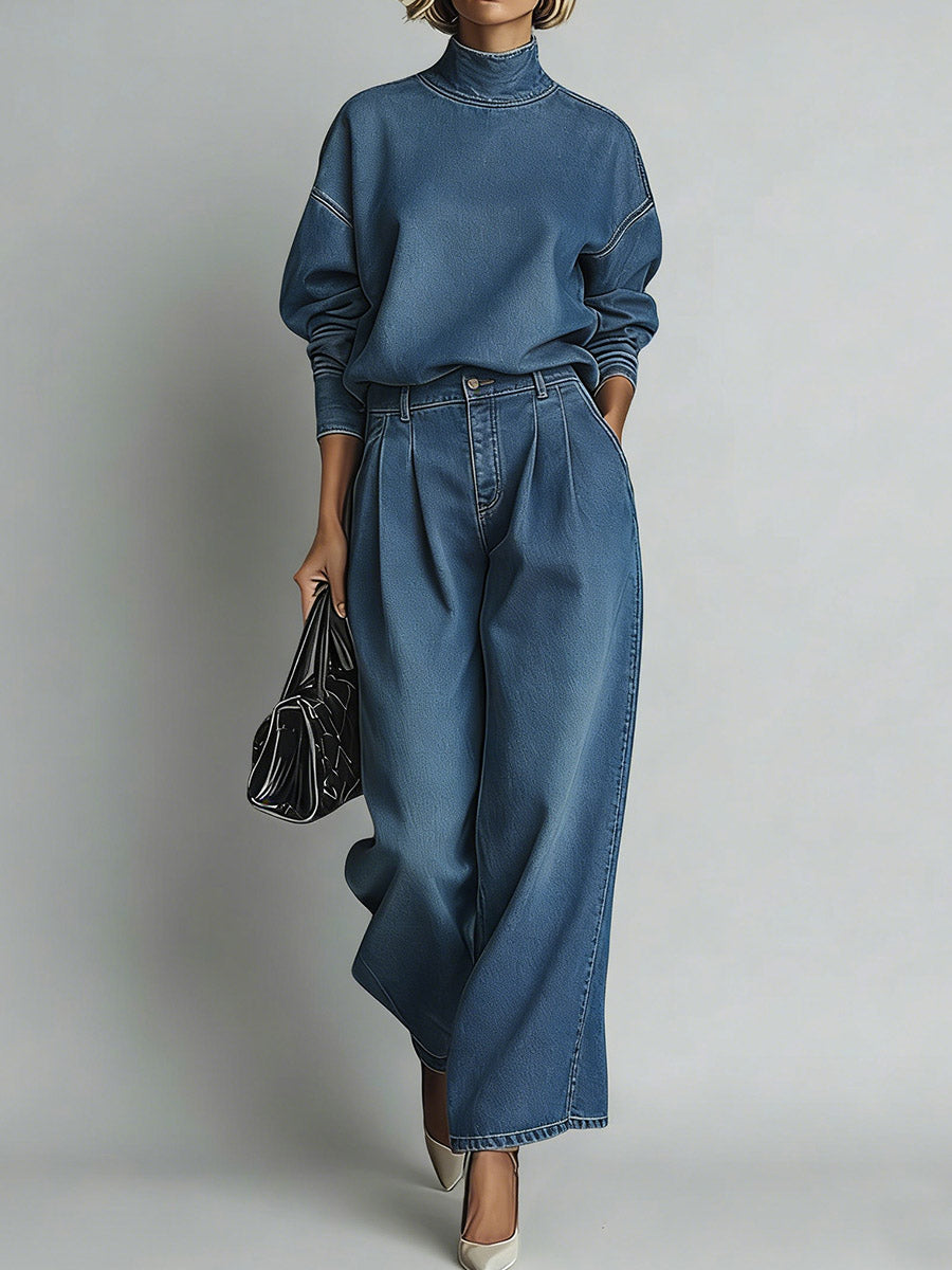 Women's Stand-collar Long-sleeved Casual Loose Denim Top And High-waisted Casual Loose Wide-leg Denim Pants Set.